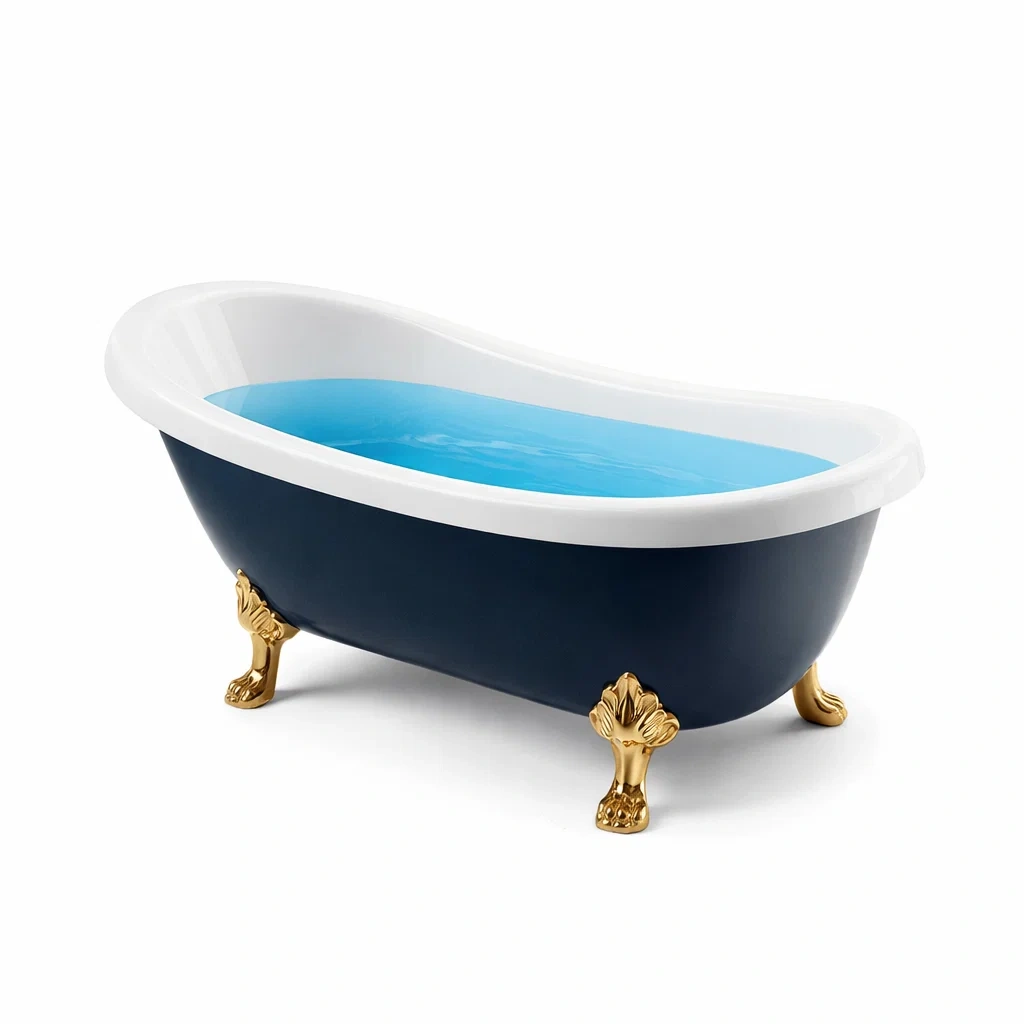 La baignoire est en acrylique avec des pieds en métal doré.