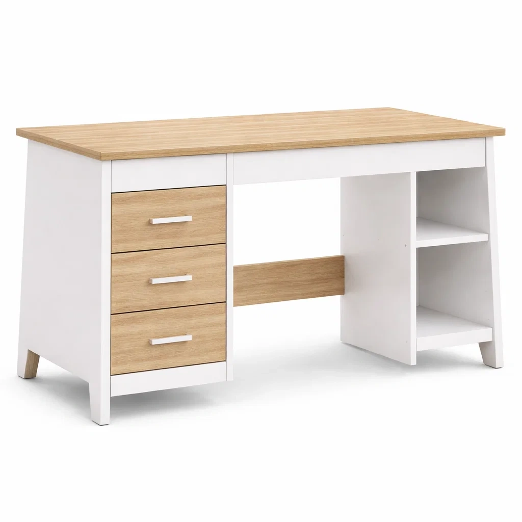 Bureau en MDF blanc et chêne clair avec tiroirs et étagères
