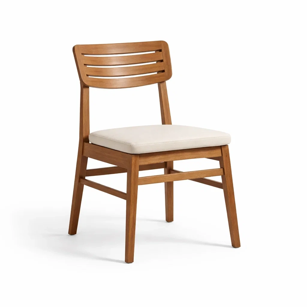 Structure en bois massif avec une assise en tissu polyester de couleur crème.