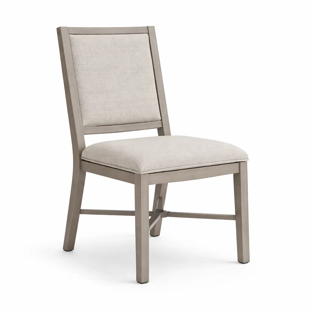 Chaise en métal durable avec un rembourrage en tissu polyester beige. Elle offre une structure solide et une assise confortable. Hauteur totale de 85 cm avec une assise haute de 45 cm. Dimensions de 45 cm de largeur et 55 cm de profondeur. Supporte un poids maximal de 120 kg. Non pliable et sans réglage de hauteur. Nécessite un montage, instructions incluses. Nettoyer avec un chiffon doux légèrement humide.