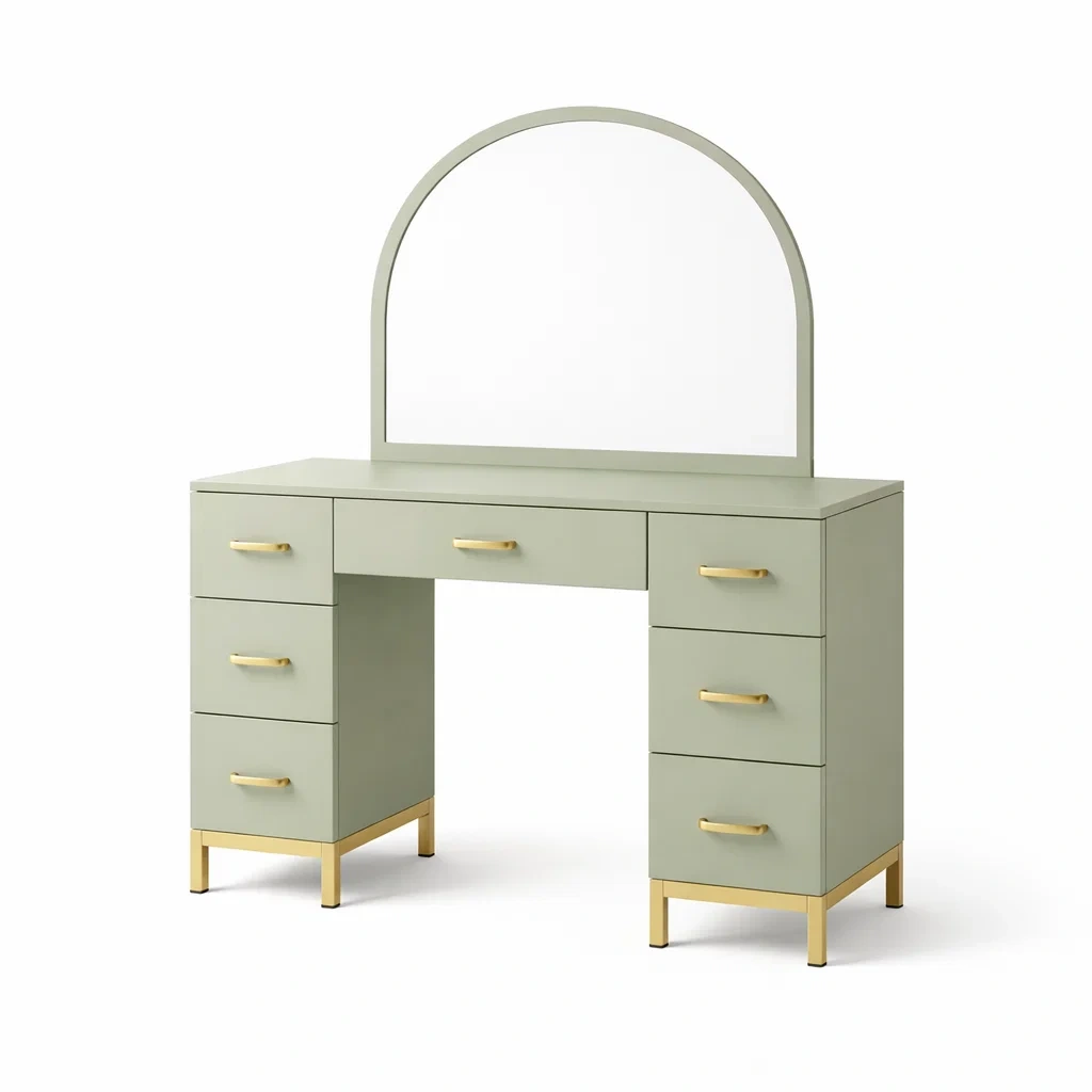 Coiffeuse en bois avec miroir et tiroirs vert sauge