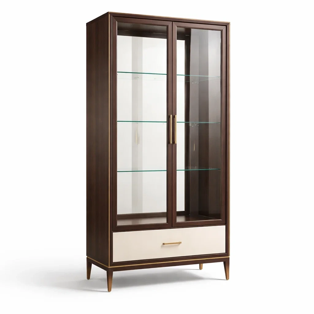 Design : Double portes vitrées, 1 tiroir, 3 étagères en verre