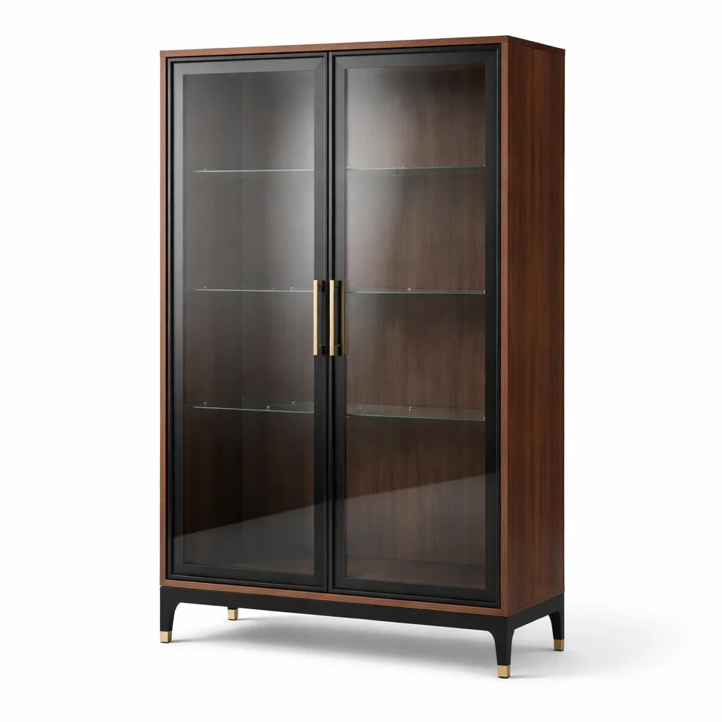 Vitrine en bois marron et noir avec verre trempé
